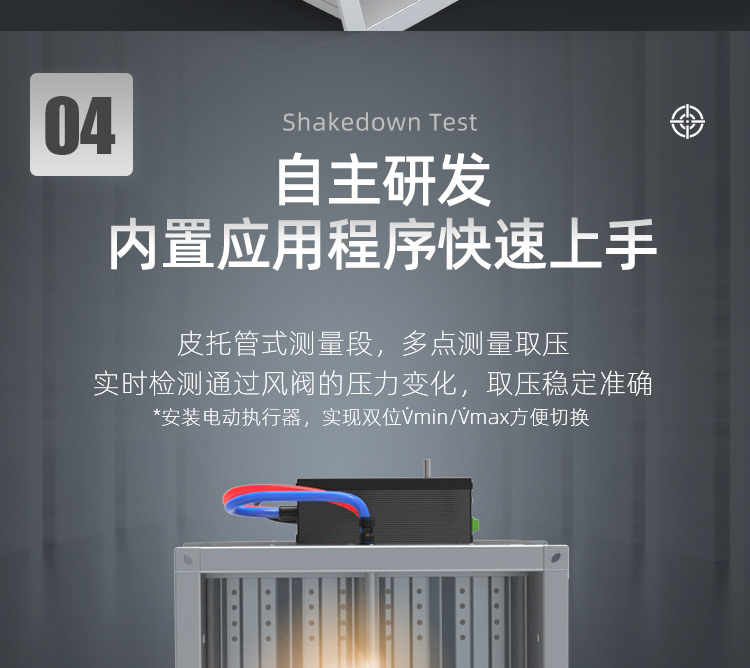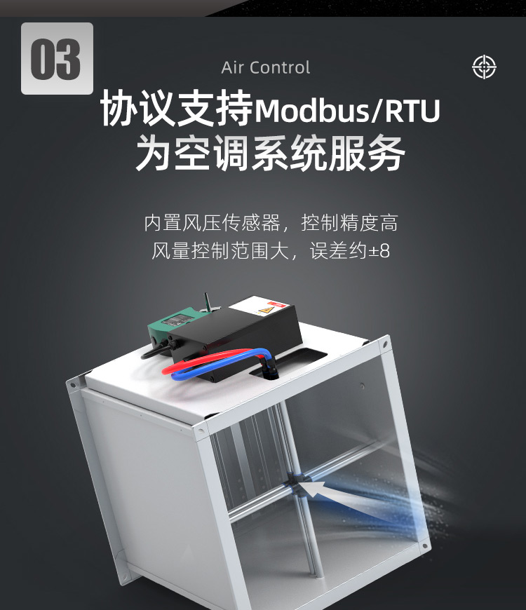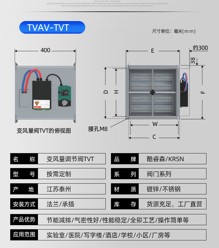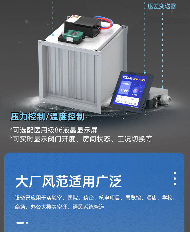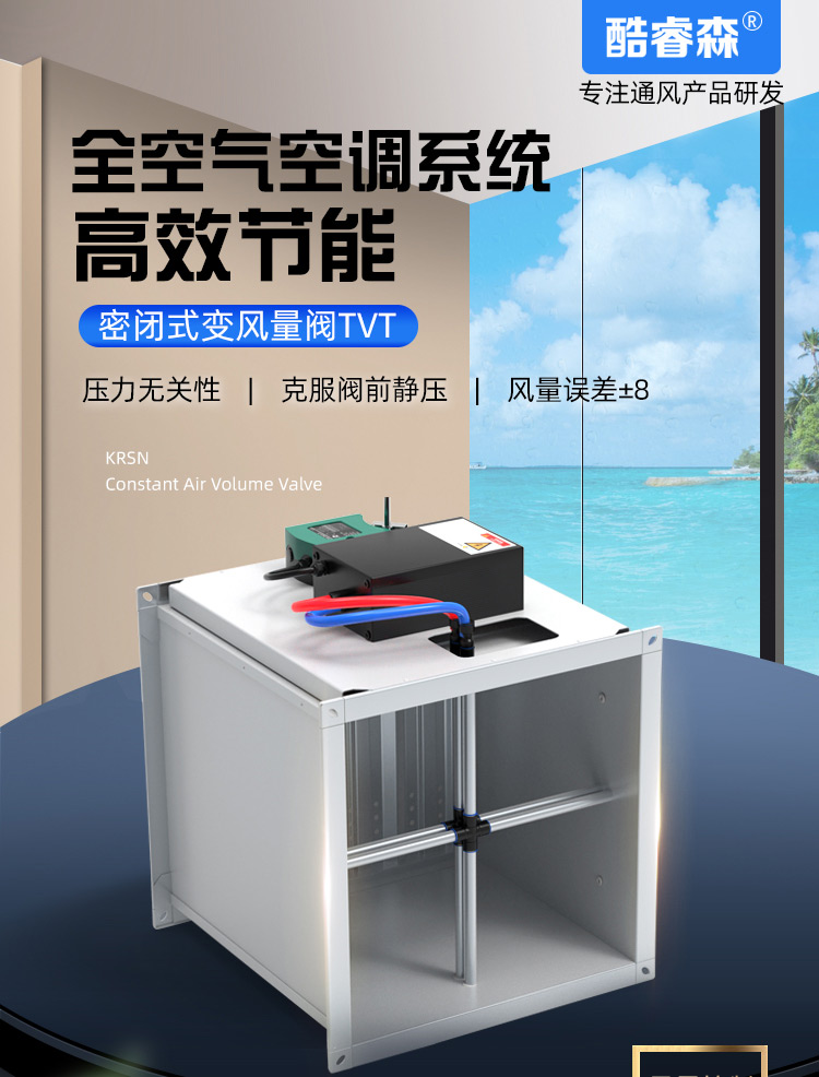 TVAV TVT:矩形变风量调节阀,用于送风或排风,可气密关闭 ,机械部件和电子控制部件组成一体, 在出厂前都已装配好,并完成软管连接和接线。每台设备都设定至所需的风量,并通过气流性能测试。 调节阀内配有多叶阀片和用于测量风量的风压传感器。 TVAV-TVT设备两端带法兰,用于连接风管; 风量控制采用闭环控制,需外部供电。根据控制要求和运行条件选择压力变送器、控制器和执行器。酷睿森控制阀上可以安装任意知名厂商的执行机构产品来满足项目的工况要求。